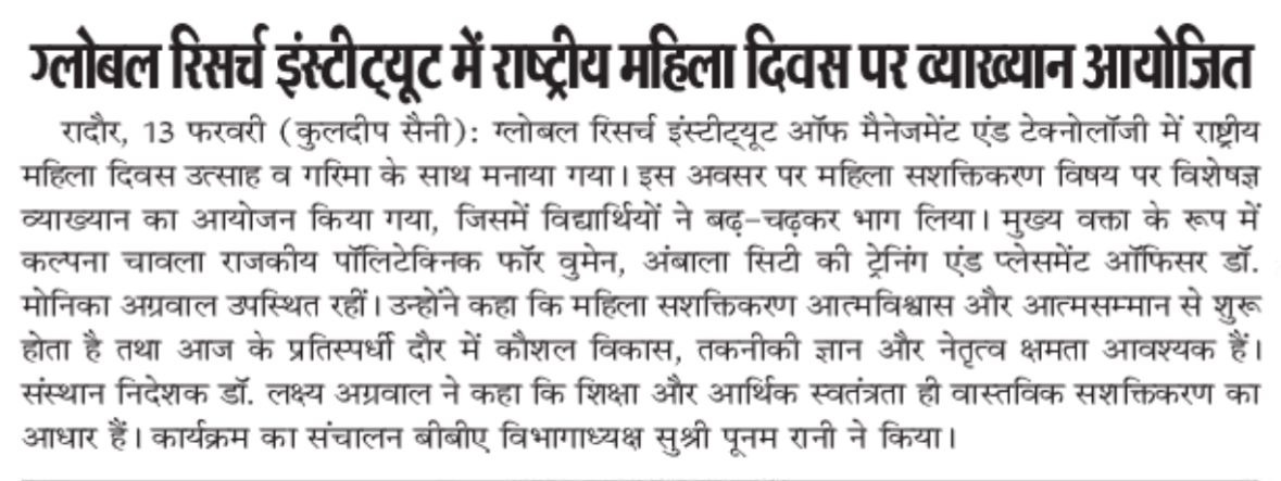 Guest Lecture was delivered by Dr. Monika, TPO, KCGPW Ambala City on the occasion of National Women’s Day at Global Research Institute of Mgt. and Tech. Nachraun, Radaur on 13-02-2026.